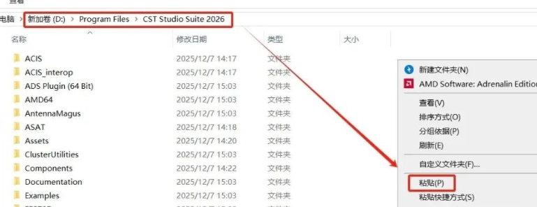 17.进入【D盘】-【Program Files】-【CST Studio Suite 2026】文件夹,空白处右键,选择【粘贴】