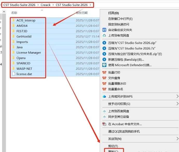 16.进入解压后的【CST Studio Suite 2026】-【Creack】-【CST Studio Suite 2026】,选择全部文件,右键,选择【复制】