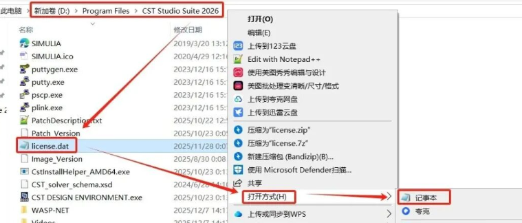 21.返回【D盘】-【Program Files】-【CST Studio Suite 2026】,选择【license.dat】,右键,选择【记事本】打开