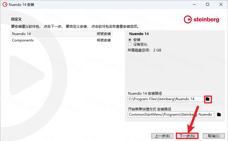 11.修改安装位置:①点击【文件夹图标】②选择需要将软件安装的磁盘(如:D盘)新建一个【Nuendo14.0】并选中③点击【确定】④点击【下一步】