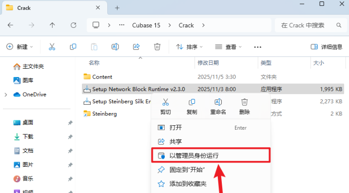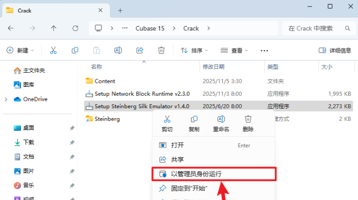 8.继续在打开的【Crack】文件夹中,鼠标右击【Setup Steinberg Silk Emulator v1.4.0】选择【以管理员身份运行】