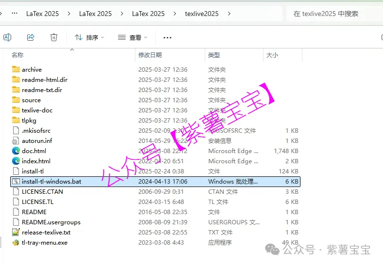 3.进入texlive2025文件夹,运行【install-tl-windows.bat】