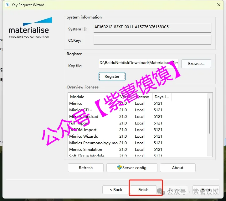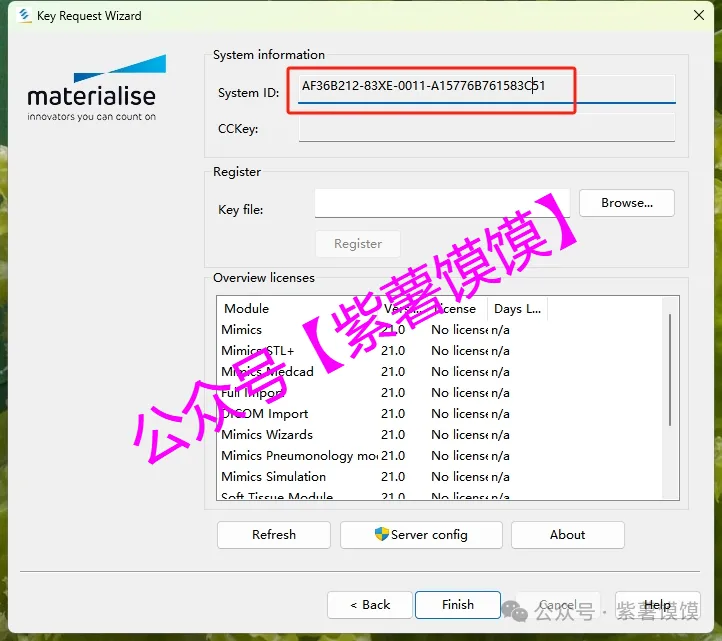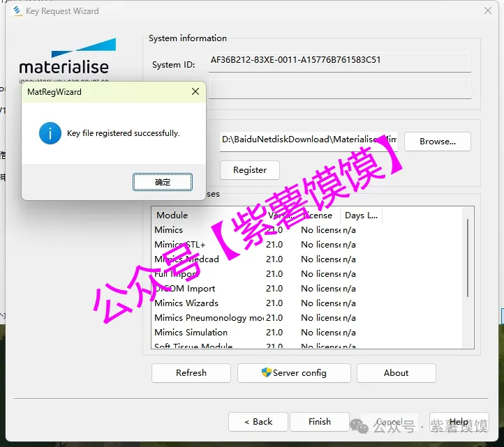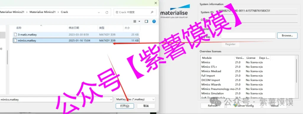 33.选择安装包解压后的【Materialise Mimics21】文件夹中的【Crack】文件夹下的【mimics.matkey】文件,点击【打开】