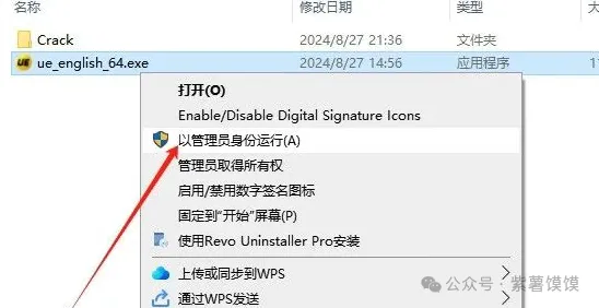 3.鼠标右键点击【ue_english_64.exe】选择【以管理员身份运行】