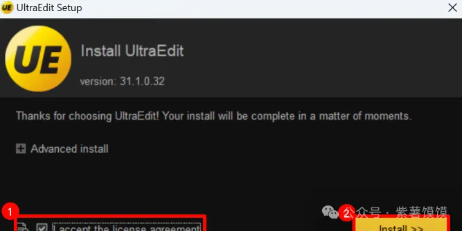 4. 勾选【I accept the..】,点击【Install】。注:更改软件安装位置请点击图中【Advanced install】
