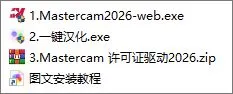 1、下载解压,得到mastercam2026官方正版+一键汉化补丁+许可证驱动;