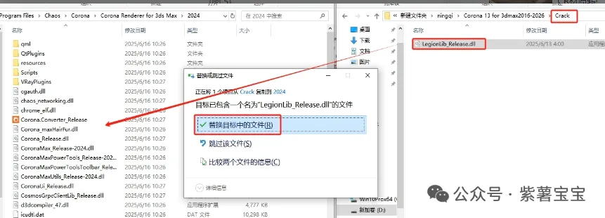6.打开Crack文件夹,复制LegionLib_Release.dll到C:\Program Files\Chaos\Corona\Corona Renderer for 3ds Max\20XX【注意:20XX代表的是你的3dmax版本】替换