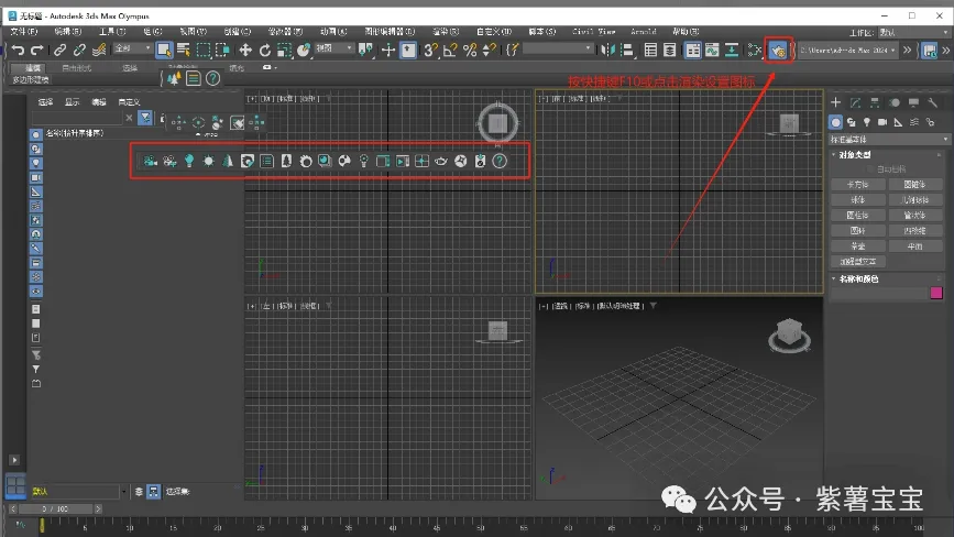 11.打开3dmax软件,在软件界面就可以看到CR渲染器功能栏了,按快捷键F10或点击渲染设置图标