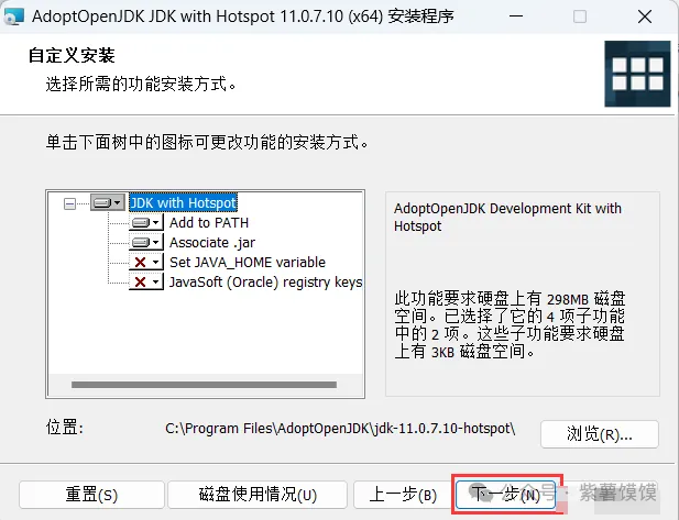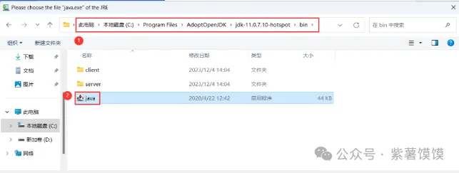 12、选择路径C:\Program Files\ AdoptOpenJDK\ jdk-11.0.7.10-hotspot\bin的【java】程序,再点击【打开】