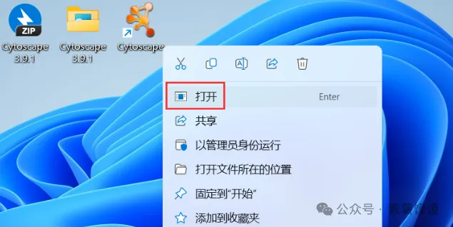 21、回到桌面,右键桌面上的【Cytoscape软件图标】,点击【打开】