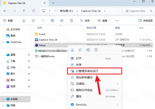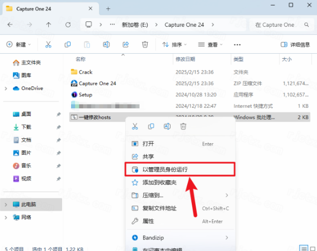 9.打开安装包解压后的【Capture One 24(64bit)】文件夹,鼠标右击【一键修改…】选择【以管理员身份运行】