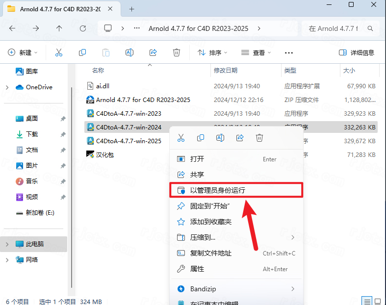 2.鼠标右击【C4DtoA-4.7.7-win-20XX】(XX代表电脑上安装的C4D版本,如:C4D2024,则运行C4DtoA-4.7.7-win-2024)选择【以管理员身份运行】