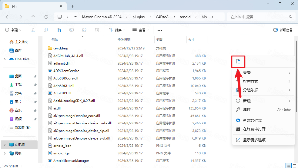 11.依次双击打开【plugins-C4DtoA-arnold-bin】文件夹,鼠标右击空白处选择【粘贴】