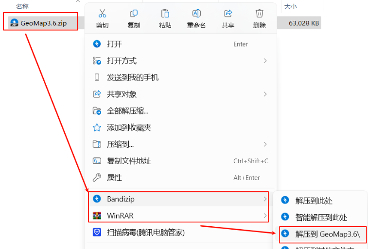 1.选中下载好的安装包,鼠标右键解压到“GeoMap3.6”文件夹