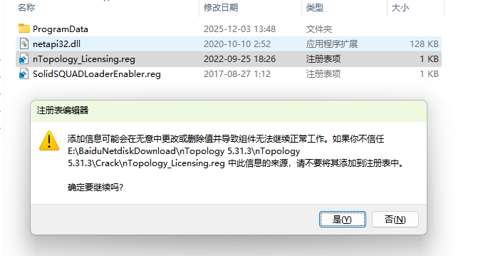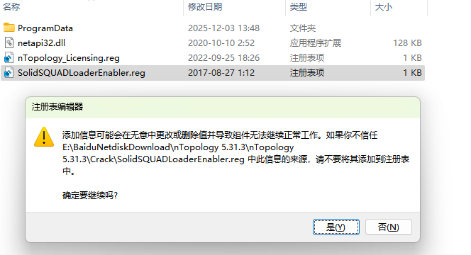 11.①打开解压的文件夹,再打开【Crack】文件夹,②选中【nTopology_Licensing.reg】和【SolidSQUADLoaderEnabler.reg】两个文件,③右击选择【打开】