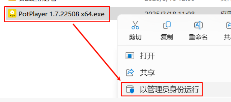 2.选中“PotPlayer 1.7.22508 x64.exe”右键以管理员身份运行