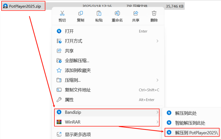 1.选中安装包“РotРlayer”鼠标右键解压到“РotРlayer2025”文件夹