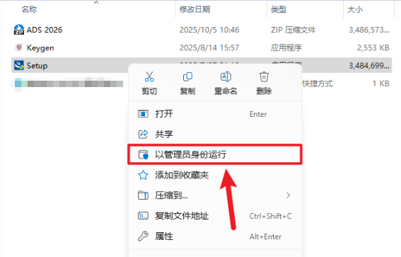 17.打开安装包解压后的【ADS 2026(64bit)】文件夹,鼠标右击解压出来的【Keygen】选择【以管理员身份运行】