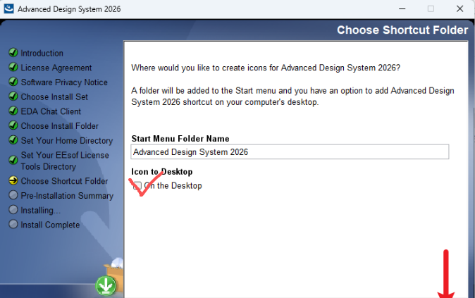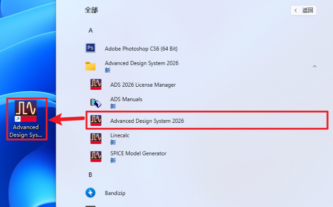 23.如果桌面没有软件图标,打开开始菜单,在所有应用中找到【Advanced Design System 2026….】图标,鼠标按住图标不动,将快捷方式拖动到桌面