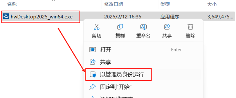 3.选中“hwDesktop2025_win64.exe”右键以管理员身份运行