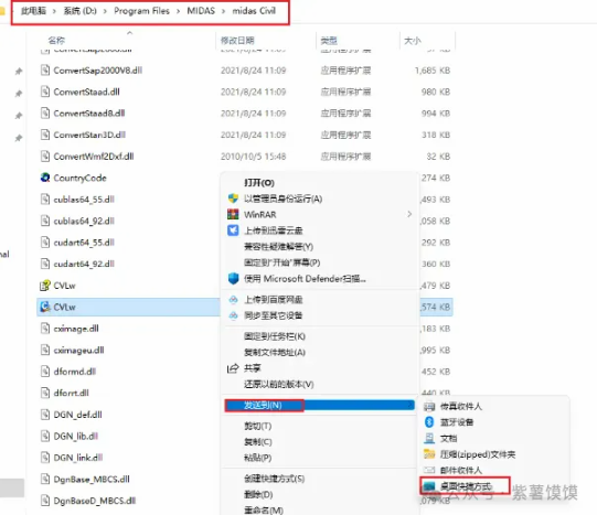 13. ①请依次打开安装位置”D:\Program Files\MIDAS\midas Civil“; ②找到”CVLw”文件鼠标右键选择”发送至“; ③点击”桌面快捷方式“即可; 【温馨提示:如您使用的其他的安装位置,请打开您选择的安装位置打开即可;】