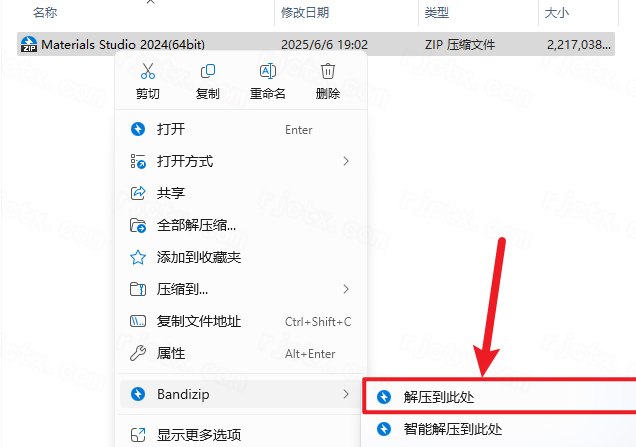 1.下载完成后,鼠标右击【Materials Studio 2024】压缩包,选择【解压至此处】
