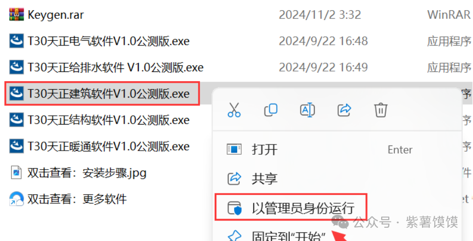 2.打开解压后的文件夹,鼠标右击需要安装的天正产品(如:天正建筑…)选择【以管理员身份运行】