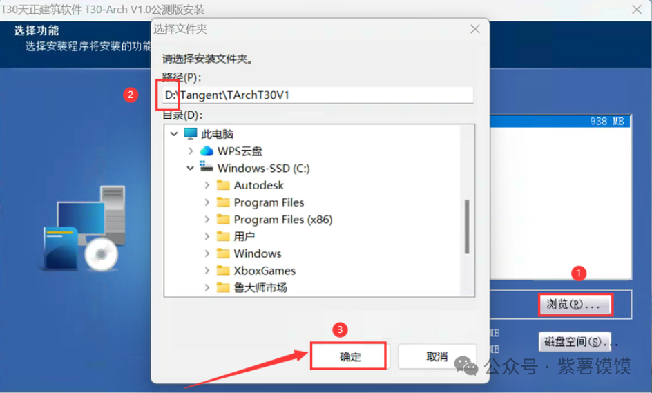 4.修改安装位置:①点击【浏览】②修改路径地址中的首字符C可更改安装位置(如:将C改为D表示安装到D盘)③点击【确定】