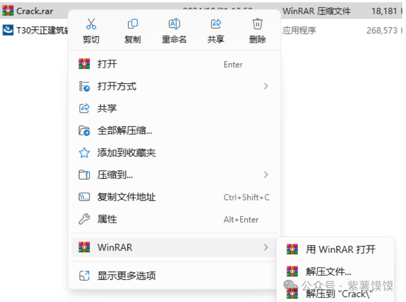 1.打开解压后的【天正T30 V1.0】文件夹,①右击【Crack】压缩包②选择电脑上安装的解压软件③点击【解压到当前文件夹】