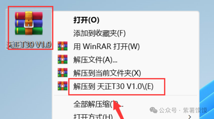 1.解压安装包:鼠标右击【天正T30 V1.0】压缩包,选择电脑上安装的解压软件,点击【解压到天正T30 V1.0】