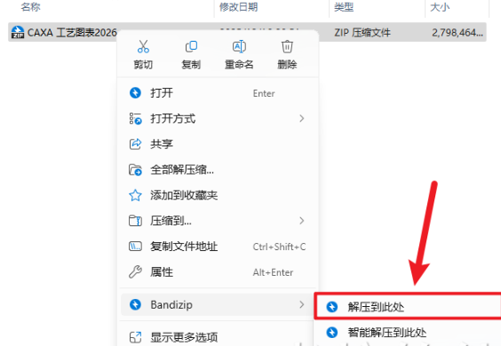 1.下载完成后,鼠标右击【CAXA 工艺图表 2026】压缩包,选择【解压至此处】