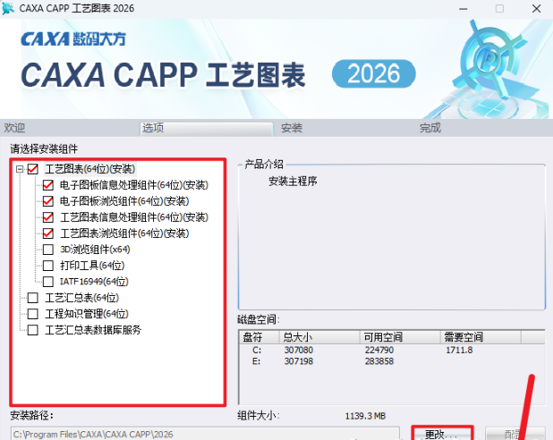5.勾选需要安装的组件,点击【更改】修改路径地址中的第一个字符C可更改安装位置(如:把C改为D软件将安装到D盘),点击【选择】,点击【开始安装】
