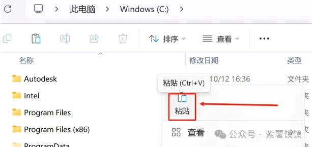 12.打开电脑C盘根目录,鼠标右击空白处选择【粘贴】,点击【替换目标中的文件】,勾选【为所有…】,点击【继续】