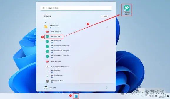 14、回到桌面,点击任务栏的【开始菜单】,在【所有应用】中找到【Artlantis 2021软件图标】,将软件图标拖到桌面上,完成软件桌面快捷方式的创建