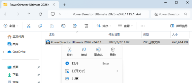 1.下载完成后,鼠标右击【威力导演 2026 v24.0.1119.1】压缩包,选择【解压至此处】