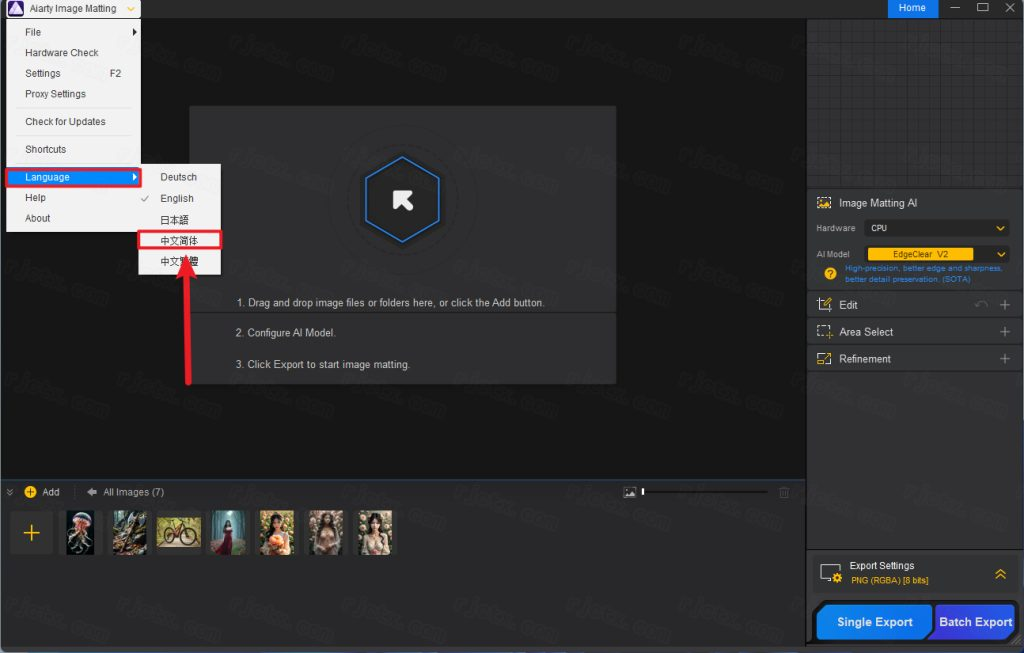 5.修改语言:①在打开的软件菜单栏中点击【AiArty Image Matting】②选择【Language】③选择【中文简体】