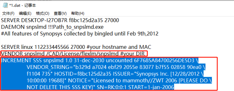 4.打开 Synopsys SSS Feature Keygen 文件夹,以记事本方式打开 license.dat,复制 USE_SERVER 下面的代码,然后也以记事本方式打开 1.dat,然后粘贴到 VENDOR 下,保存然后关闭