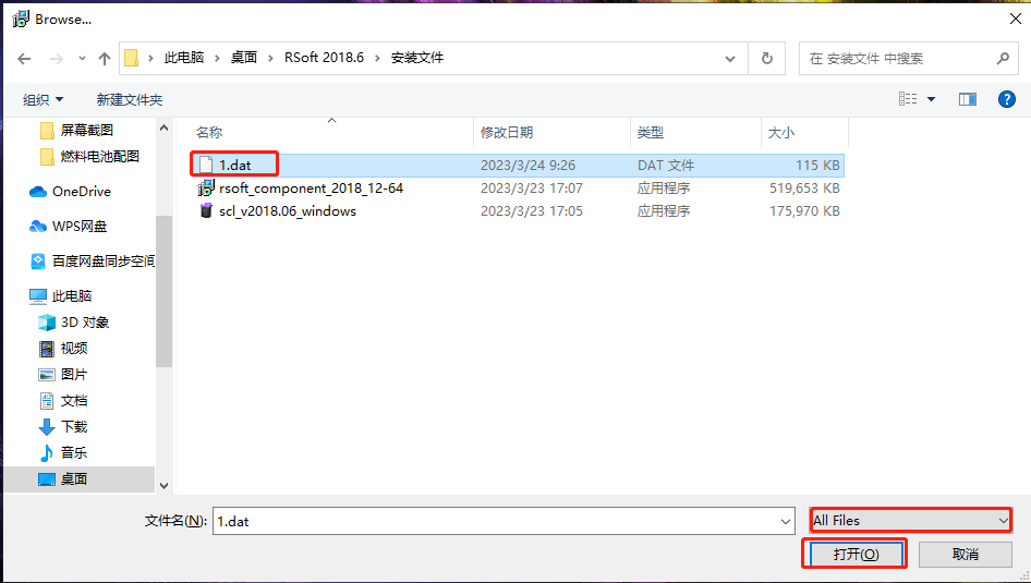 点击 Browse,文件类型选为 All Files,选择上一步中复制到安装文件的 1.dat,然后打开