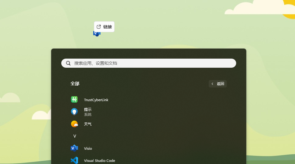 12.创建桌面快捷方式:点击桌面任务栏中的【开始图标】点击【所有应用】,将【Visio】图标拖到电脑桌面
