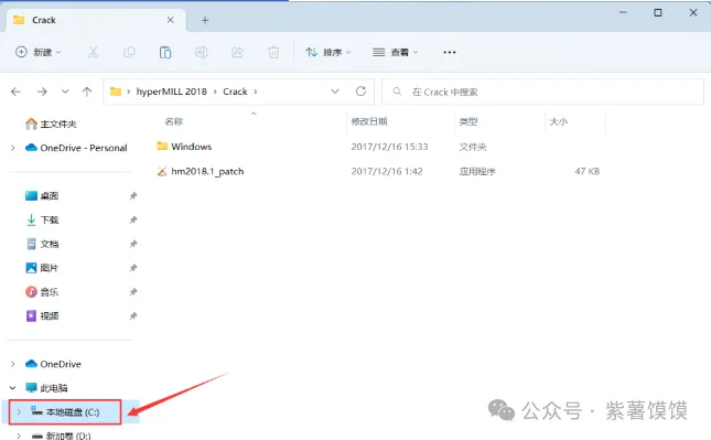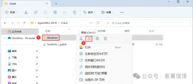 19、回到hyperMILL 2018文件夹下的Crack文件夹,找到【Windows】文件夹,右键点击【复制按钮】