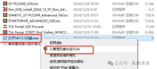 2.选择【打开NET3.5功能.exe】鼠标右键以管理员身份运行(目的:检查你电脑是否安装NET3.5功能)