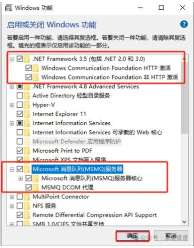 3.检查是否有【.NET Framework 3.5 (包括,NET 2.0 和 3.0)】和【Microsoft 消息队列(MSMQ)服务器】,点击确定。然后就会自动搜索检查,没有的话,根据操作提示安装即可