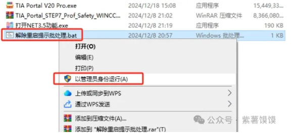 31.选择【解除重启提示批处理.bat】鼠标右键以管理员身份运行