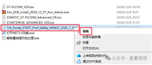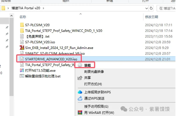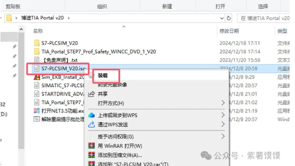 22.选择【S7-PLCSIM_V20.iso】鼠标右键,点击【装载】,还是和前面一样,没有装作就选择解压的方式