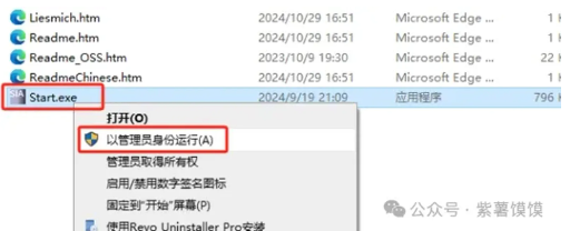 7.打开装载或解压后的文件夹,选择【Start.exe】鼠标右键以管理员身份运行