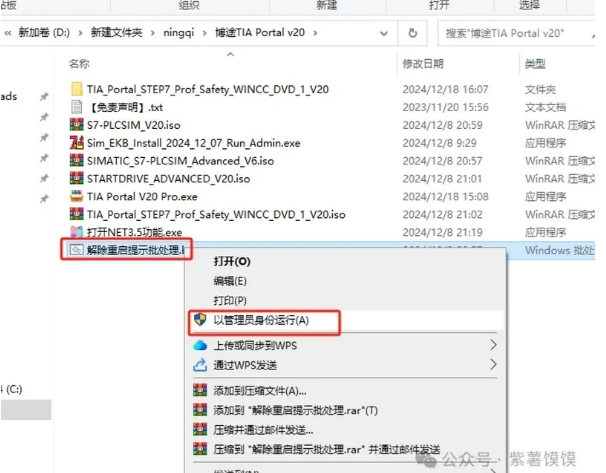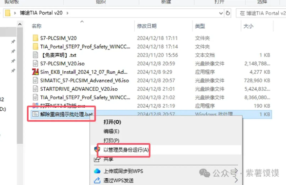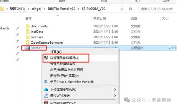 23.打开装载或解压后的【S7-PLCSIM_V20】文件夹,选择【Start.exe】鼠标右键以管理员身份运行