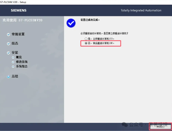 19.安装成功,提示重启计算机,选择【否,稍后重启计算机(N)】,然后点击关闭