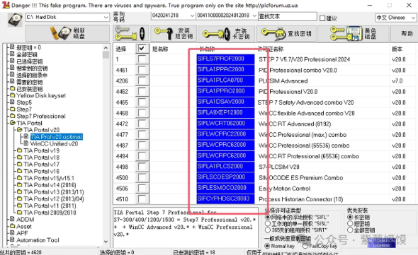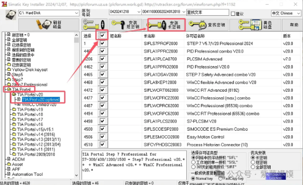 43.❶选择【TlA Portal】-【TlA Portal V20】,❷选择【TA Prof v20 optimal】,❸勾选(图中所示标注,全选),❹点击【安装长密钥】