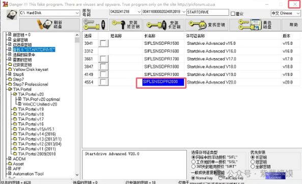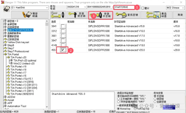 45.在查找文本处输入【STARTDRIVE】,然后回车,勾选“Startdrive Advanced V20.0”选项,再点击【安装长密钥】