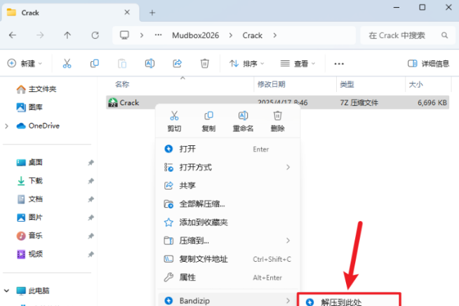 10.① 鼠标右击【Crack】压缩包② 选择电脑上安装的解压软件③ 点击【解压到当前文件夹】